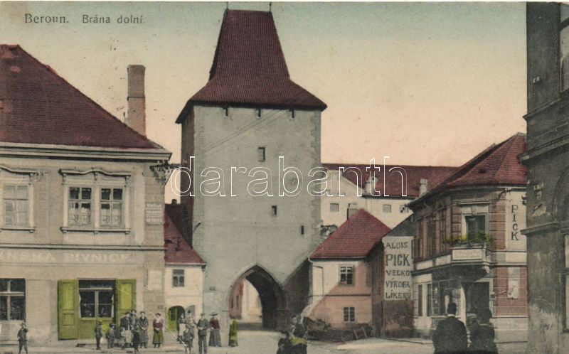 Beroun lower gates with the liquor shop of Alois Pick (small tear) https://www.darabanth.com/de/143-Fernauktion/143.0/Ansichtskarten/Tschechische-Republik~900023/Beroun-lower-gates-with-the-liquor-shop-of-Alois-Pick-small-tear~II426437