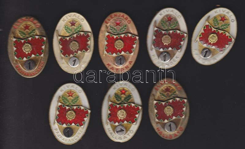 Beschreibung: DN. "Kiváló Katona" + "Élenjáró Hallgató" + "Kiváló Hallgató" + "Kiváló Rajparancsnok" 8db klf jelvény T:2,3