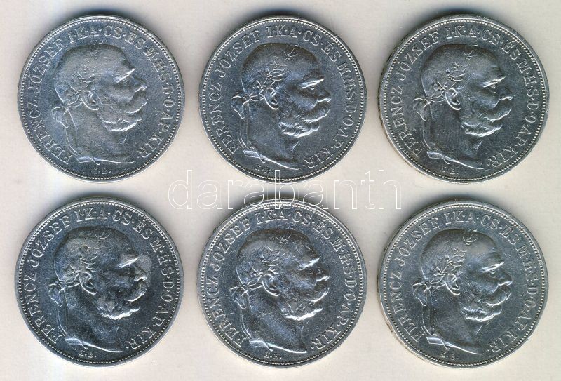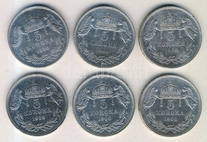 1900. 5K Ag (4x) + 1908. 5K Ag (2x) T:2 https://www.darabanth.com/de/143-Fernauktion/143.0/Numismatik/Ungarische-Munzen~900102/1900-5K-Ag-4x-plus-1908-5K-Ag-2x-T2~II424381