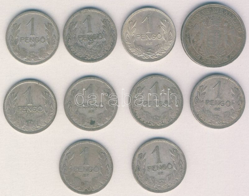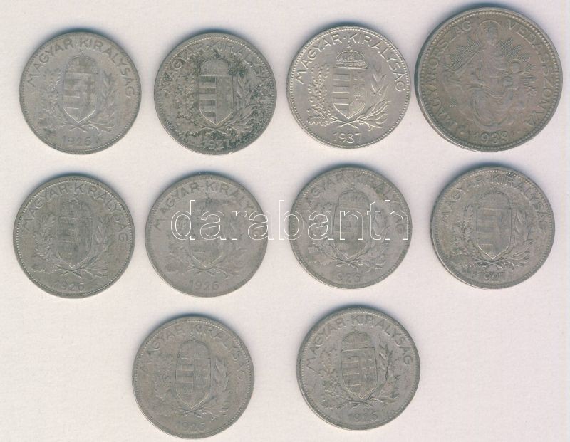 1926-37. 1P Ag (9x) + 1939. 2P Ag "Madonna" T:2,3 https://www.darabanth.com/de/143-Fernauktion/143.0/Numismatik/Ungarische-Munzen~900102/1926-37-1P-Ag-9x-plus-1939-2P-Ag-Madonna-T2-3~II424253