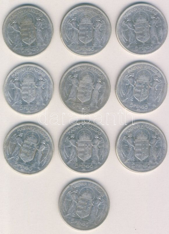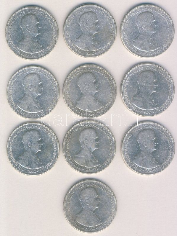 1930. 5P Ag "Horthy jobbra" (10x) T:3 ph. https://www.darabanth.com/de/143-Fernauktion/143.0/Numismatik/Ungarische-Munzen~900102/1930-5P-Ag-Horthy-jobbra-10x-T3-ph~II424201