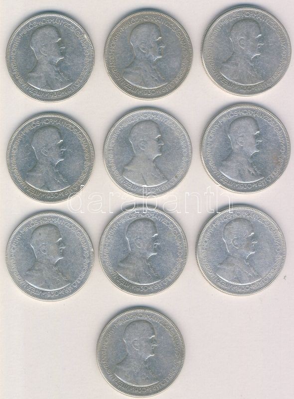 1930. 5P Ag "Horthy jobbra" (10x) T:3 ph. https://www.darabanth.com/de/143-Fernauktion/143.0/Numismatik/Ungarische-Munzen~900102/1930-5P-Ag-Horthy-jobbra-10x-T3-ph~II424203