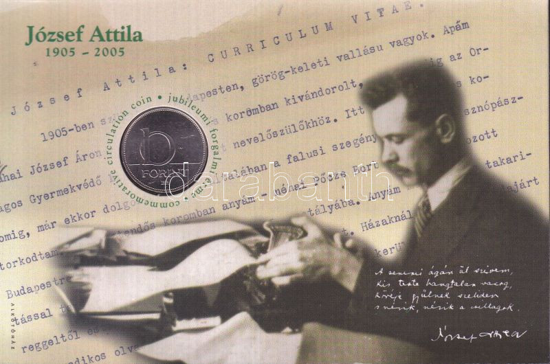 2005. 10Ft "József Attila" számozott emléklapon T:1 Csak 12000db! https://www.darabanth.com/de/143-Fernauktion/143.0/Numismatik/Ungarische-Munzen~900102/2005-10Ft-Jozsef-Attila-szamozott-emleklapon-T1-Csak-12000db~II382417