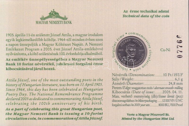 Beschreibung: 2005. 10Ft "József Attila" számozott emléklapon T:1 Csak 12000db!