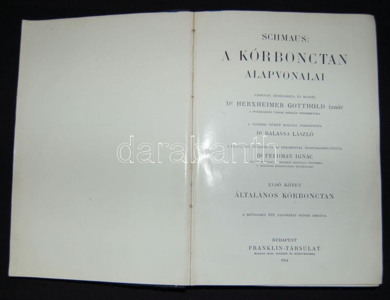 Schmaus: A kórbonctan alapvonalai I. kötet 410 nagyrészt színes ábrával. Bp., 1914 Franklin. Kissé sérült egészvászon kötésben