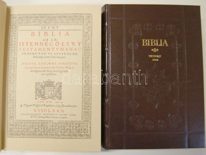 Bp. 1990. Magyar Heli... https://www.darabanth.com/de/144-Fernauktion/144.0/Andere-Sammelgebiete/Bucher-Religion~197/Vizsolyi-Biblia-I-II-kotet-Facsimile-kiadas--Bp-1990-Magyar-Helikon-Kiadoi-egeszbor-kot~II430484