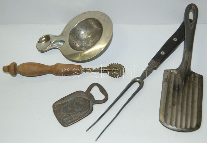 Beschreibung: 5 db régi konyhai eszköz: sörnyitó, klopfoló, húsvilla, derelyeszaggató, teaszűrő