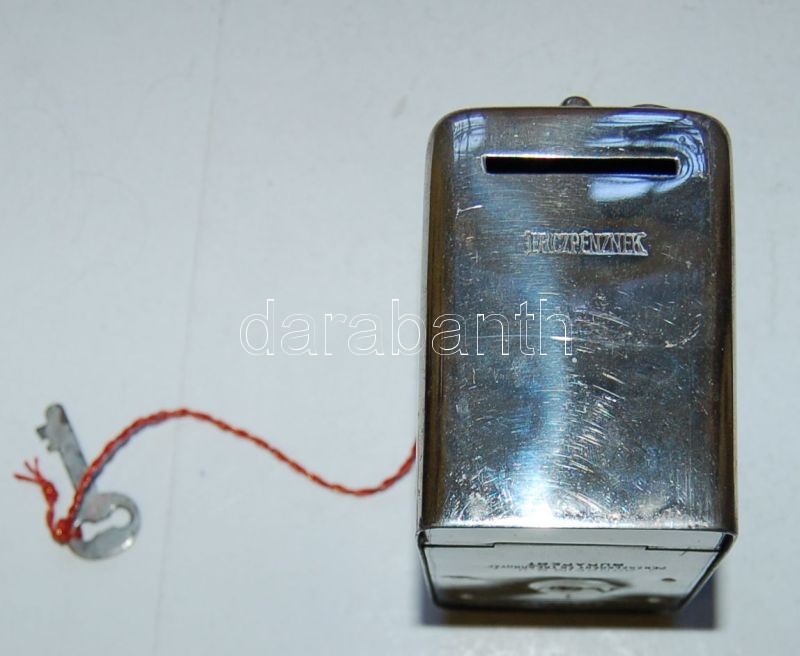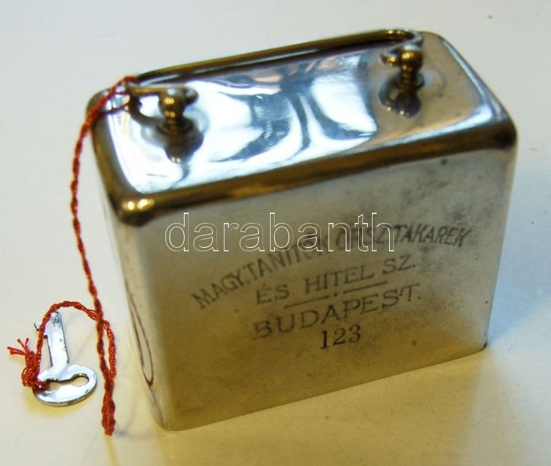 "Magy. Tanítók Orsz. Takarék és Hitel Sz. Budapest 123" feliratú fém p... https://www.darabanth.com/de/144-Fernauktion/144.0/Andere-Sammelgebiete/Flohmarkt~204/Magy-Tanitok-Orsz-Takarek-es-Hitel-Sz-Budapest-123-feliratu-fem-persely-kulccsal-6x11x9-c~II430011