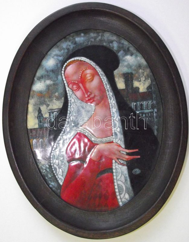 Beschreibung: Vágó István: Erzsébet megtudja, hogy gyermeket vár, tűzzománc, szép ovális keretben, 17x21 cm