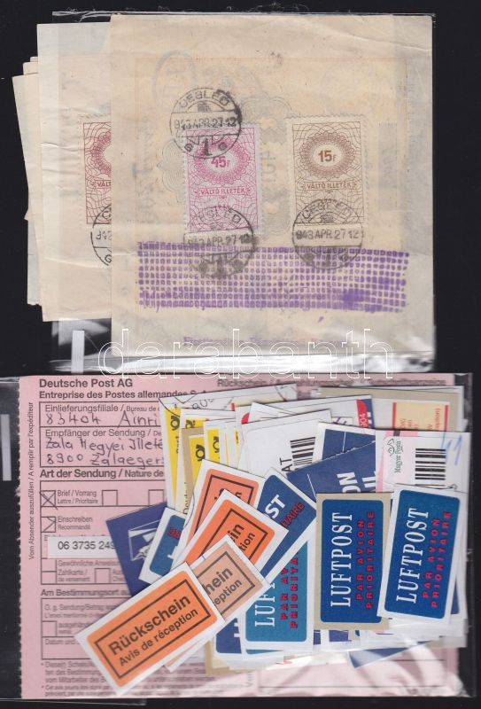 Beschreibung: 50 db külföldi postai kezelési jegy (ajánlott, légiposta stb) + 1940-43 8 db Váltóűrlap-szelvény 1934 Váltóilleték bélyegekkel