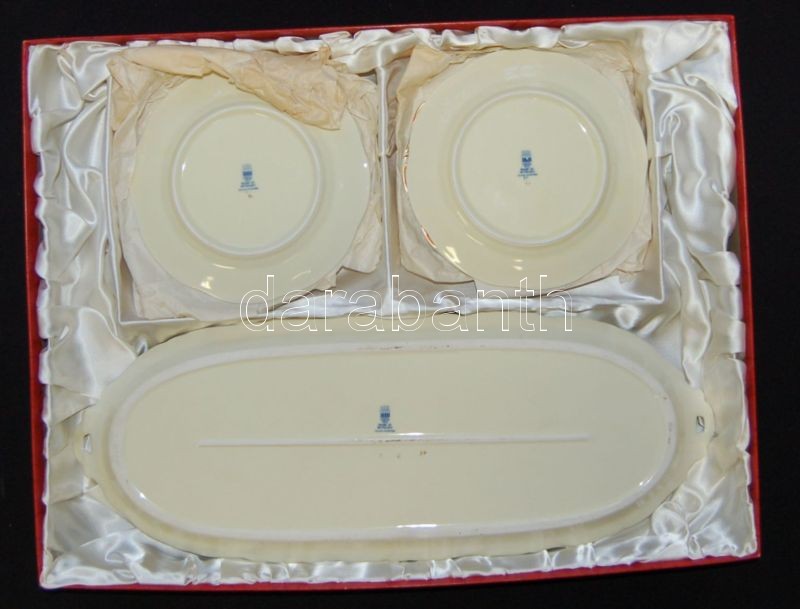 cca 1940 Kézzel festett 6 személyes Zsolnay süteményes készlet 6 tányér + tál eredeti dobozában / Set of beautiful Zsolnay chinaware cake-dish in original box