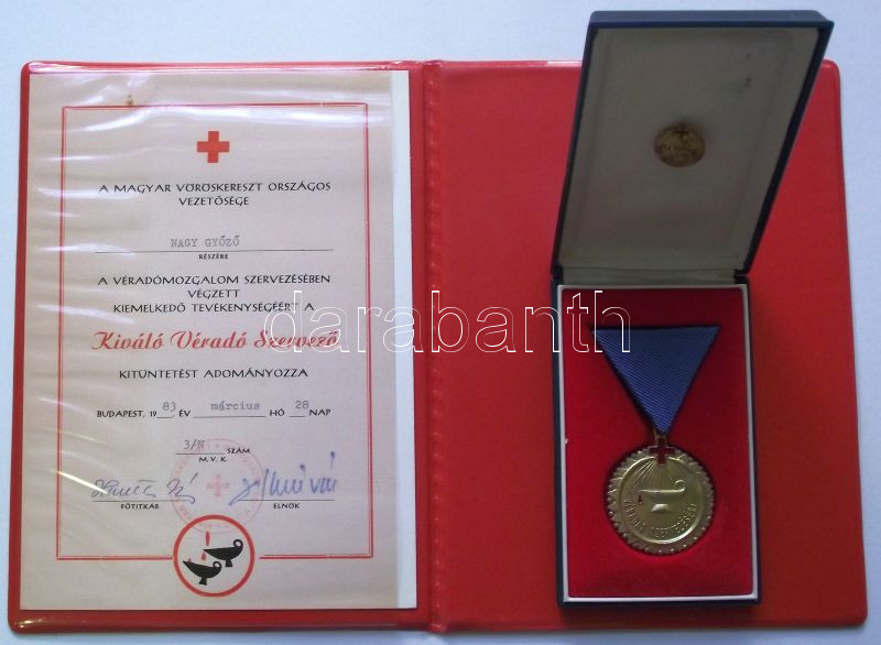 Beschreibung: 1983. "kiváló Véradó Szervező" kitüntetés eredeti dísztokban miniatűrrel és adományozói okirattal T:2