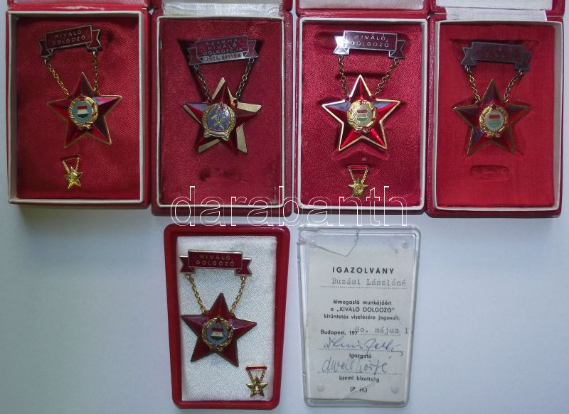 cca 1950-80. "Szakma Kiváló Dolgozója-Közl. Építés" eredeti dísztokban T:3 + 4db "Kiváló Dolgozó" kitüntetés, mindegyik dísztokban, egyik adományozói igazolvánnyal T:vegyes