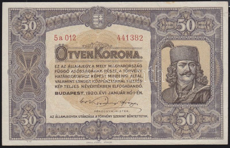 1920. 50K "Orell Füssli Zürich" T:I-/II https://www.darabanth.com/de/144-Fernauktion/144.0/Numismatik/Ungarische-banknoten~1000088/1920-50K-Orell-Fussli-Zurich-TI-II~II429021