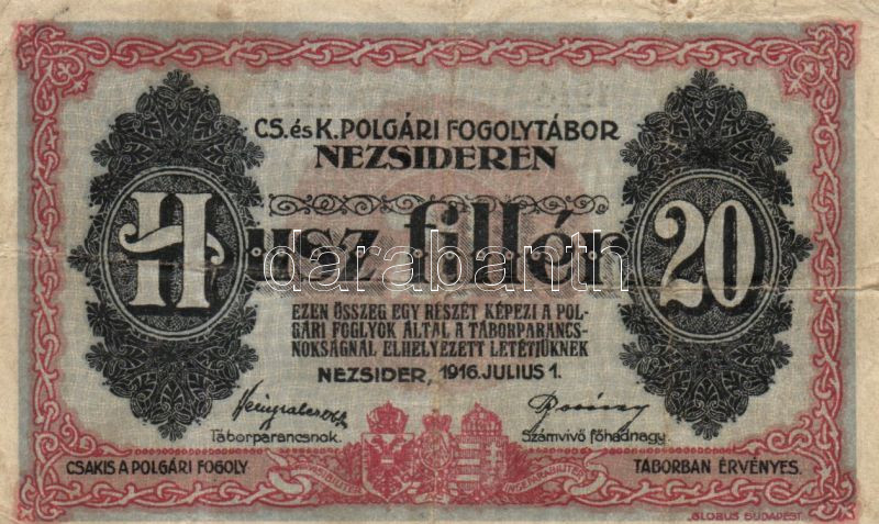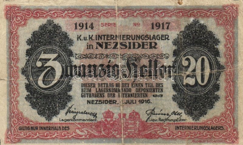 Nezsider/hadifogolytábor 1916. 20f T:III- https://www.darabanth.com/de/144-Fernauktion/144.0/Numismatik/Ungarusche-und-Auslandische-Notgelden~1000087/Nezsiderhadifogolytabor-1916-20f-TIII-~II429935