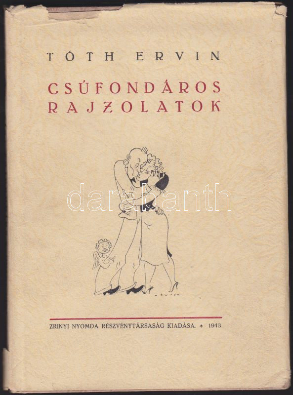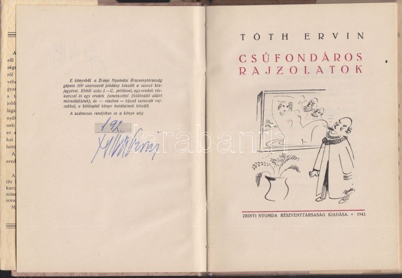 1943 Tóth Ervin: Csúfondáros rajzolatok, Zrínyi Nyomda Részvénytársaság Kiadása, dedikált sorszámozott példány, 192/500., 12 db eredeti fametszettel, papírkötésben, kiváló állapotban