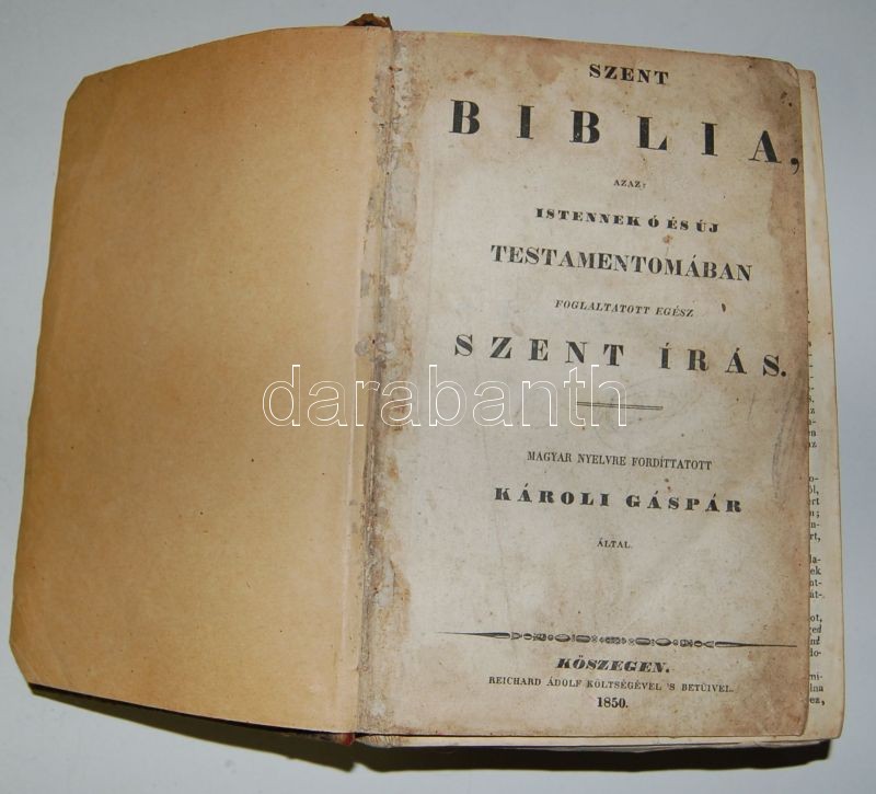 Károli féle Szent Biblia - Kőszeg, 1850 Reichard Ádolf, sérült egészbő... https://www.darabanth.com/de/145-Fernauktion/145.0/Andere-Sammelgebiete/Bucher-Religion~218/Karoli-fele-Szent-Biblia--Koszeg-1850-Reichard-Adolf-serult-egeszbor-kotesben~II424999