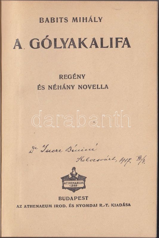 Babits Mihály: A gólyakalifa - Első kiadás! Bp., 1916 Athenaeum kiadói... https://www.darabanth.com/de/145-Fernauktion/145.0/Andere-Sammelgebiete/Bucher-Sonstige-Raritaten~221/Babits-Mihaly-A-golyakalifa--Elso-kiadas-Bp-1916-Athenaeum-kiadoi-festett-felvaszon-kot~II412031