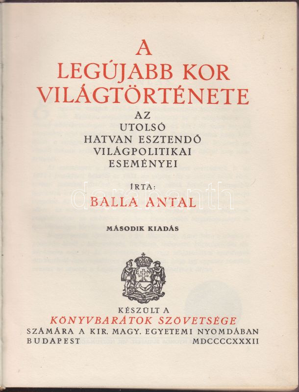Balla Antal: A legújabb kor világtörténete. Az utolsó hatvan esztendő világpolitikai eseményei. Készült a Könyvbarátok Szövetsége számára. Bp. 1932. Második kiadás. Királyi Magyar Egyetemi Nyomda. 371 p. Aranyozott kiadói félbőr kötésben (gerinc javítsra szorul)