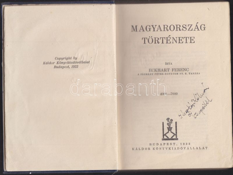 Bp., 1933. Káldor. Világosság... https://www.darabanth.com/de/145-Fernauktion/145.0/Andere-Sammelgebiete/Bucher-Sonstige-Raritaten~221/Eckhart-Ferenc-Magyarorszag-tortenete--Bp-1933-Kaldor-Vilagossag-324-p--Aranyozott-va~II433872