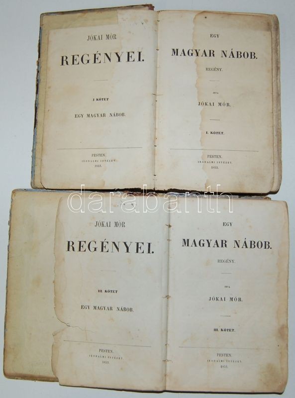 Jókai Mór: Egy magyar nábob I. és III. kötet. Első kiadás! Jókai végszavával. Pest, 1853, Irodalmi intézet. Emich Gusztáv nyomdája. Megviselt kiadói félvászon kötésben, kötéstábla elvált (foltos)