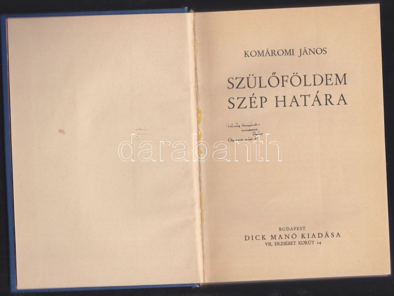 Komáromi János: Szülőföldem szép határa Bp. Dick Manó, Dedikált! Arany... https://www.darabanth.com/de/145-Fernauktion/145.0/Andere-Sammelgebiete/Bucher-Sonstige-Raritaten~221/Komaromi-Janos-Szulofoldem-szep-hatara-Bp-Dick-Mano-Dedikalt-Aranyozott-sorozati-vaszo~II427288