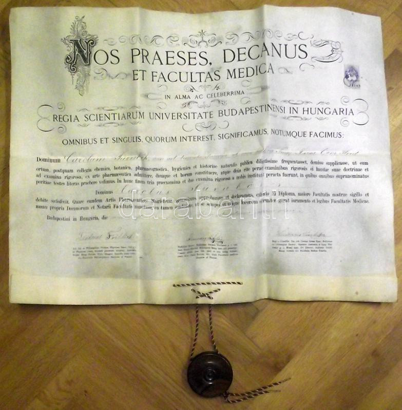 1898 Szép állapotú gyógyszerész diploma pergamenen, ép függő viaszpecséttel. Az oklevél hátoldalán a Hont megyei főispán és főorvos patika-nyitásra jogosító engedélye / Pergamin diploma for pharmacist and authorisation for opening pharmacy, issued in Sahy 60x55 cm