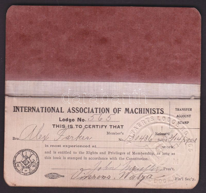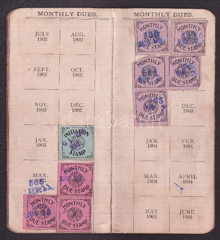 1903 Hajógépészek nemzetközi szövetségének igazolványa magyar mérnök részére, tagsági bélyegekkel / International association of (naval) machinists. US id card for Hungarian with due stamps
