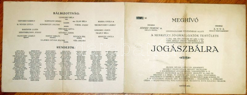 1926 Meghívó a Miskolci Joghallgatók Testületének Jogászbáljára https://www.darabanth.com/de/145-Fernauktion/145.0/Andere-Sammelgebiete/Drucksachen~212/1926-Meghivo-a-Miskolci-Joghallgatok-Testuletenek-Jogaszbaljara~II385296
