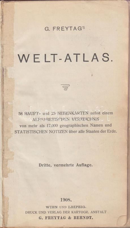 1908 G. Freytag & Berndt Világatlasz 83 db térképpel, kiadói félbőr kö... https://www.darabanth.com/de/145-Fernauktion/145.0/Andere-Sammelgebiete/Landkarten~207/1908-G-Freytag-Berndt-Vilagatlasz-83-db-terkeppel-kiadoi-felbor-kotesben-1908-Freytag-~II435868