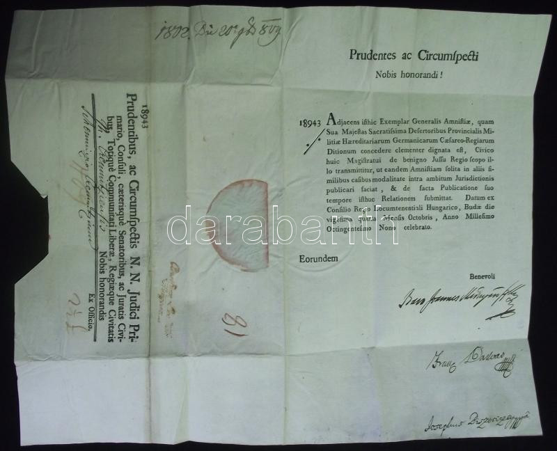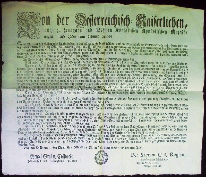 1809 I. Ferenc által kiadott általános amnesztiát kihirdető okirat katonaszökevények részére elküldve Helytartótanácsi ex offo levélben. A levélen többek között Darvas Ferenc író, követ saját kezű aláírásával / Warrant about general amnesty for deserters issued by Franz I. 40x50 cm