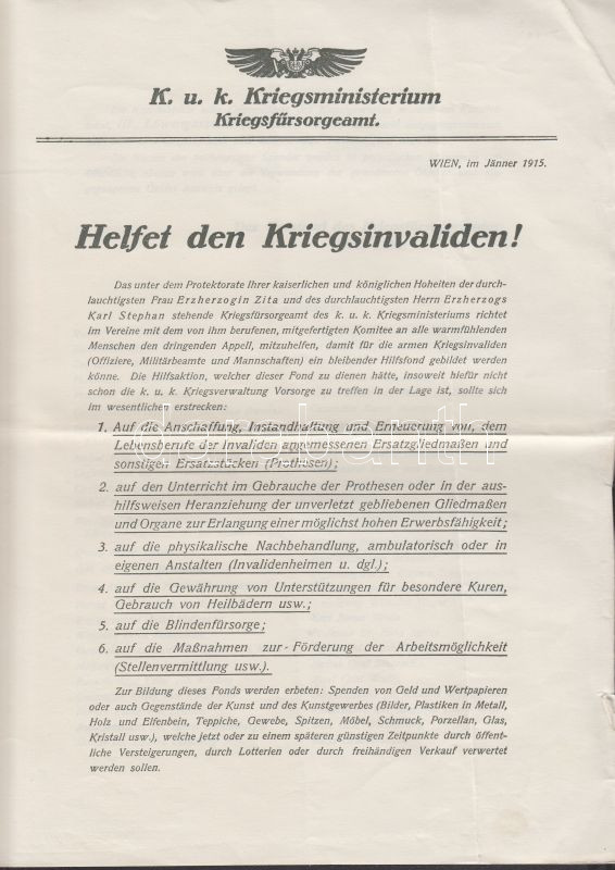 1915 A k.u.k. hadirokkantak megsegélyezésére felhívás neves támogatókk... https://www.darabanth.com/de/145-Fernauktion/145.0/Andere-Sammelgebiete/Militaria~211/1915-A-kuk-hadirokkantak-megsegelyezesere-felhivas-neves-tamogatokkal~II397318