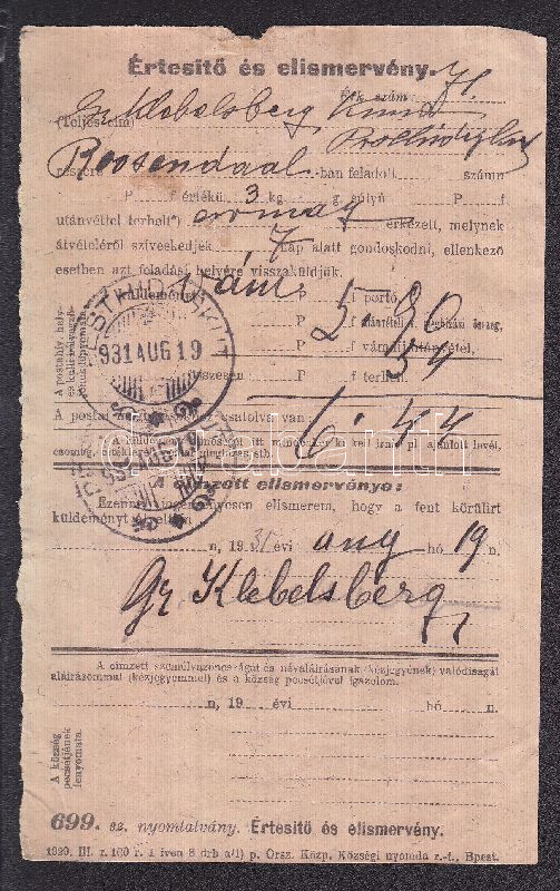 Beschreibung: 1931 Gr. Klébersberg Kúnó közoktatásügyi miniszter aláírása postai átvételi elismervényen