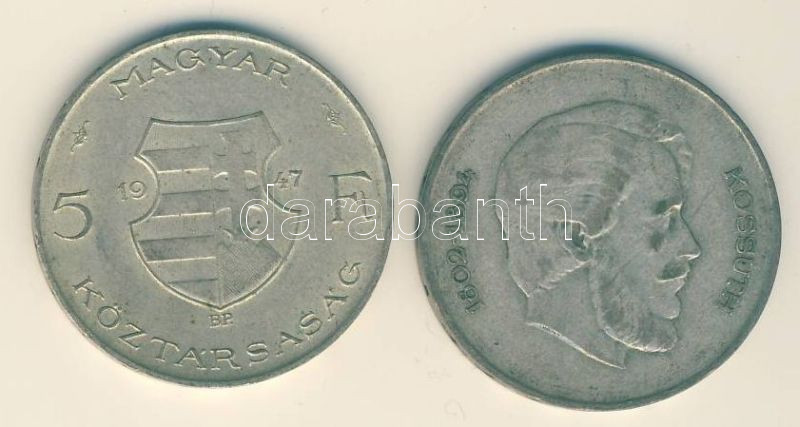 1947. 5Ft Ag (5x) "Kossuth" T:2-,3 ph. https://www.darabanth.com/de/145-Fernauktion/145.0/Numismatik/Ungarische-Munzen~500099/1947-5Ft-Ag-5x-Kossuth-T2-3-ph~II431945