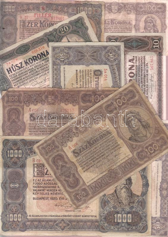Beschreibung: kis korona tétel: 1920. 10K (10x) + 20K (10x) + 50K "Orell Füssli Zürich" (4x) + 100K "Orell Füssli Zürich" (4x) + 1000K "Orell Füssli Zürich" + 1923. 100K (2x) nyomdahely jelöléssel és jelölés nélkül + 500K nyomdahely jelölés nélkül + 1000K "8 FILLÉR NYOLC FILLÉR" felülnyomással T:II,III,IV