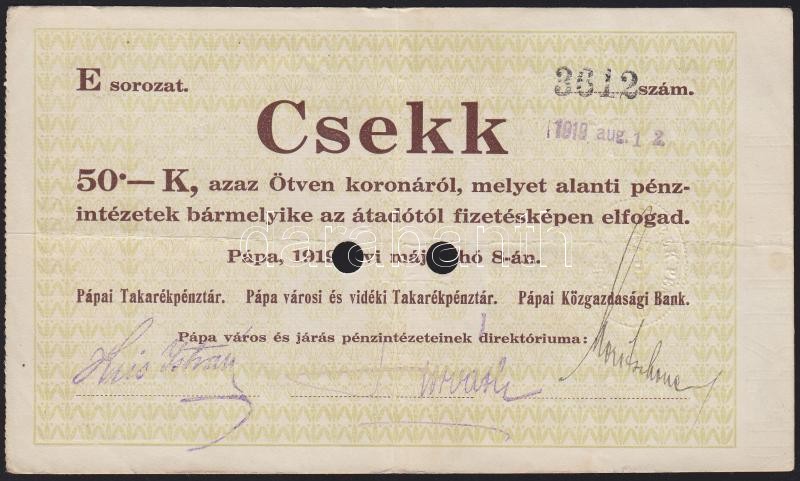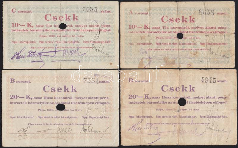Pápa 1919. "Pápai csekk" 10K (2x) + 20K (2x) + 50K lyukasztással érvénytelenítve T:III