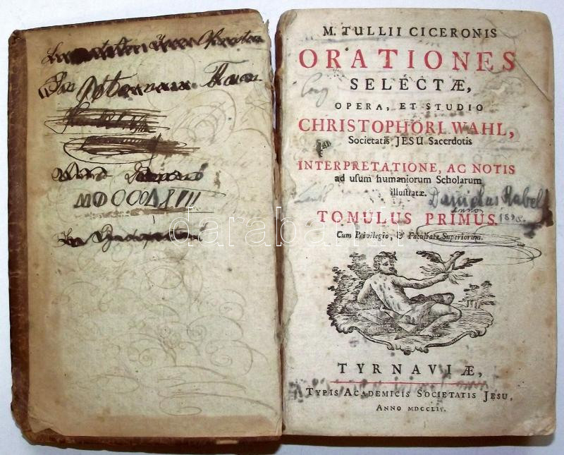 Cicero: Orationes selectae, opera, et studio Christophori Wahl, interpretatione, I. köt. Nagyszombat, 1754. (Az utolsó lap hiányzik - last page missing) korabeli bordázott egészbőr kötésben.