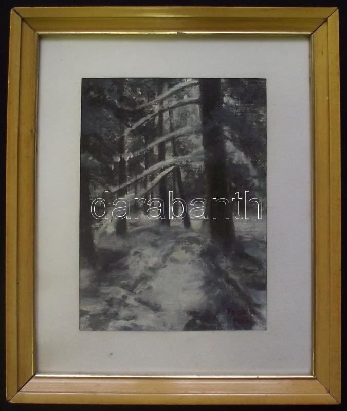 Beschreibung: Fock A. jelzéssel: Téli erdő, olaj-farost, keretben, 31x38 cm