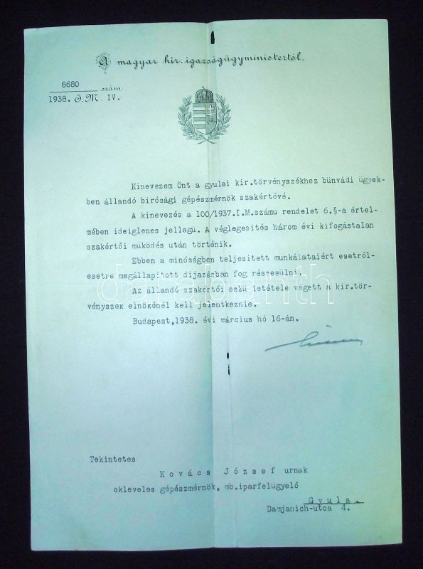 Beschreibung: 1938 Lázár Andor igazságügy-miniszter saját kezű aláírása kinevezési okmányon