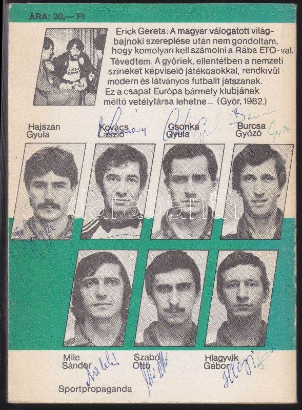 1982 Futball-láz! A Verebes József vezette Győri ETO labdarúgócsapat t... https://www.darabanth.com/de/146-Fernauktion/146.0/Andere-Sammelgebiete/Signatur~228/1982-Futball-laz-A-Verebes-Jozsef-vezette-Gyori-ETO-labdarugocsapat-tagjai-altal-alairt-ko~II412605