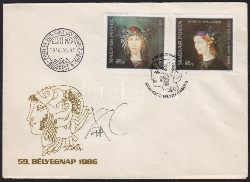 Beschreibung: 1986 Bélyegnap FDC, rajta a tervező Szász Endre saját kezű aláírásával