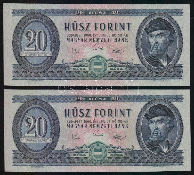 Beschreibung: 1969. 20Ft (2x) egymásutáni sorszámmal! T:I