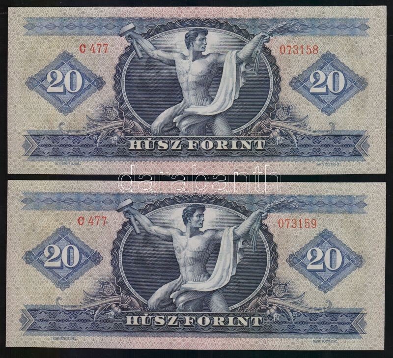 1969. 20Ft (2x) egymásutáni sorszámmal! T:I https://www.darabanth.com/de/146-Fernauktion/146.0/Numismatik/Ungarische-Banknoten~500107/1969-20Ft-2x-egymasutani-sorszammal-TI~II394836