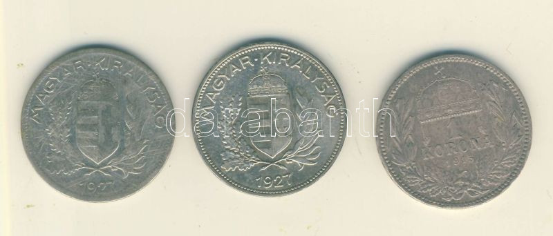 1915. 1K Ag + 1927. 1P Ag (2x) T:2,2-,3 ph. https://www.darabanth.com/de/146-Fernauktion/146.0/Numismatik/Ungarische-Munzen~500108/1915-1K-Ag-plus-1927-1P-Ag-2x-T2-2-3-ph~II438815