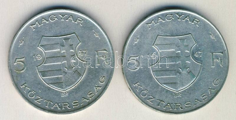 1947. 5Ft Ag (2x) "Kossuth" T:2- ph. https://www.darabanth.com/de/146-Fernauktion/146.0/Numismatik/Ungarische-Munzen~500108/1947-5Ft-Ag-2x-Kossuth-T2-ph~II437745