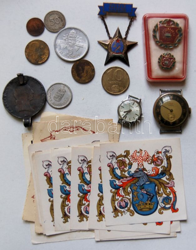 Beschreibung: Kis bolhapiac tétel benne numizmatika, szocreál jelvények, néhány ex libris