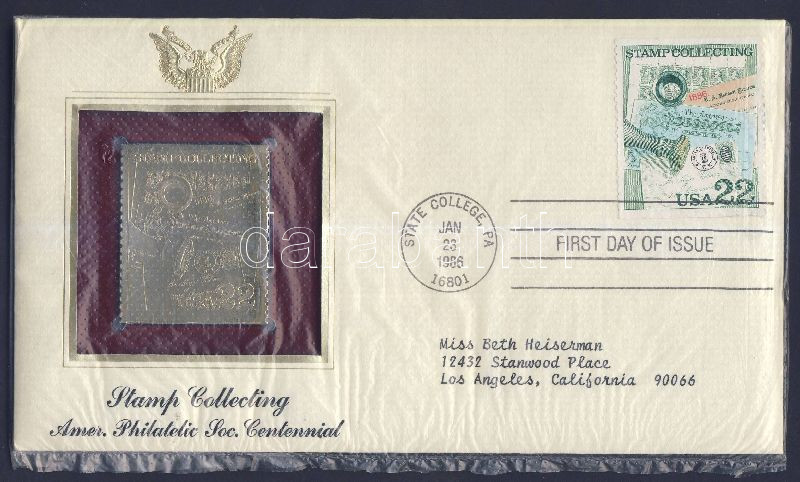 Beschreibung: USA/ 1986. "American Philatelic Society 100 éves - aranyozott bélyeg formájú emlékplakett borítékban, bélyeggel és elsőnapi bélyegzővel T:1