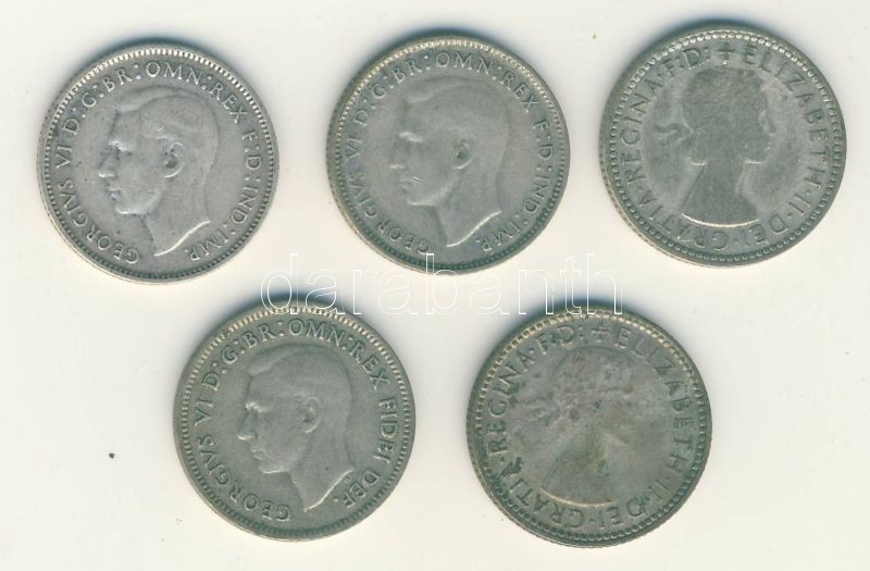 Ausztrália 1942-1958. Sixpence Ag (5x) klf évszámokkal! T:2-,3 https://www.darabanth.com/de/147-Fernauktion/147.0/Numismatik/Auslandische-Munzen~500116/Ausztralia-1942-1958-Sixpence-Ag-5x-klf-evszamokkal-T2-3~II442926