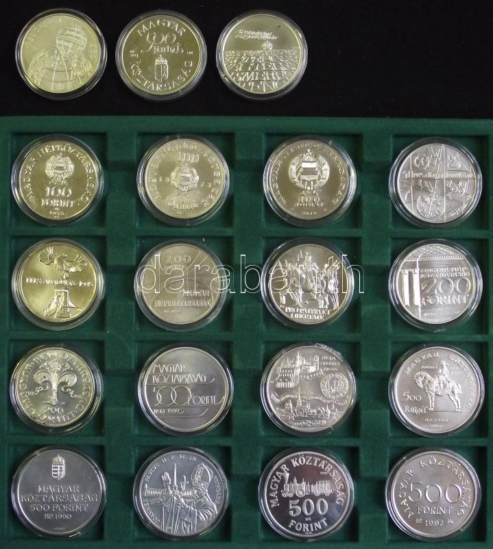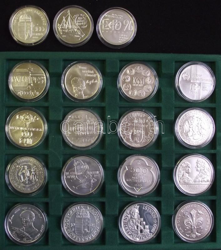 Nagyon szép gyűjtemény, forint emlékveretek, összesen 19db: 1972. 100Ft Ag "Budapest" T:BU + 1973. 100Ft Ag "Petőfi" T:BU + 1974. 100Ft Ag "KGST" T:BU + 1974 100Ft Ag "50 éves az MNB" T:BU + 1975. 200Ft Ag "Felszabadulás" T:BU + 1975. 200Ft Ag "MTA" T:BU + 1976. "Pro Pátria-II.Rákóczi Ferenc" 200Ft Ag T:BU + 1977. 200Ft Ag "Nemzeti Múzeum" T:BU + 1978. 200Ft Ag "Első magyar aranyforint" T:BU + 1989. 500Ft Ag "Téli olimpia-Albertville" T:BU + 1990. 500Ft Ag + 500Ft Ag "Mátyás király" pár T:BU + 1990. 500Ft Ag "Kölcsey Ferenc" T:BU + 1991. 500Ft Ag "II. János Pál pápa látogatása" T:BU + 1991. 500Ft Ag "Széchenyi István" T:PP + 1992. 500Ft Ag "Károly Róbert" T:BU + 1992. 500Ft Ag "Űrkutatás" T:BU + 1993. 500Ft Ag "Régi dunai hajók - Árpád" T:BU + 1993. 500Ft Ag "Expo" T:BU