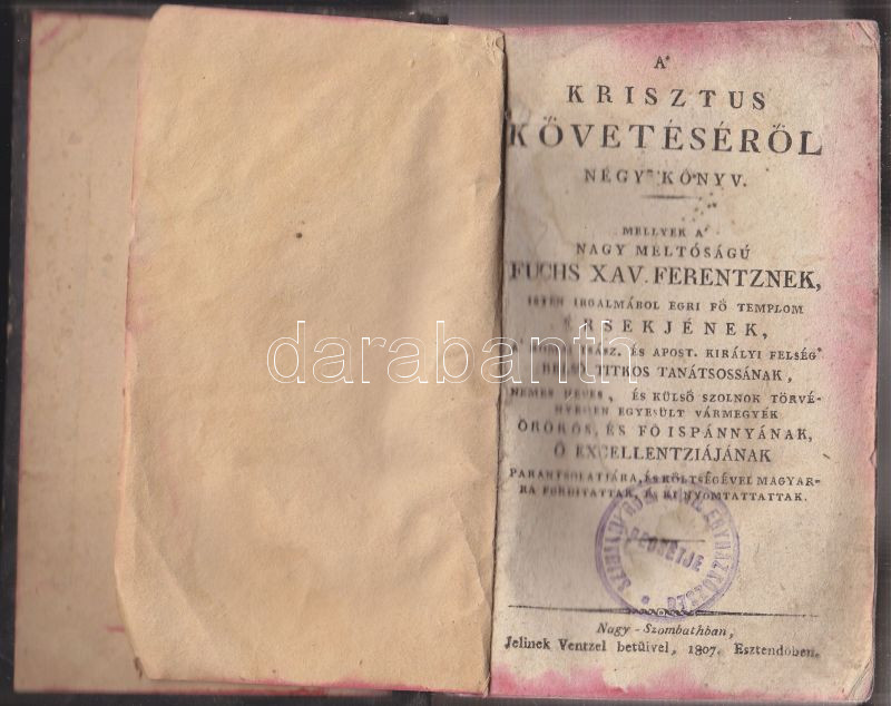 A Krisztus követéséről négy könyv - mellyek a nagy méltóságú Fuchs Xav. Ferentznek Isten irgalmából Egri fő templom érsekjének.... parantsolatjára és költségével magyarra fordítattak és kinyomtattattak. Nagy-Szombathban Jellinek Ventzel Betüivel 1807 esztendőben 580p. korabeli félvászon kötésben. Az utolsó lap sérült, egyébként jó állapotban